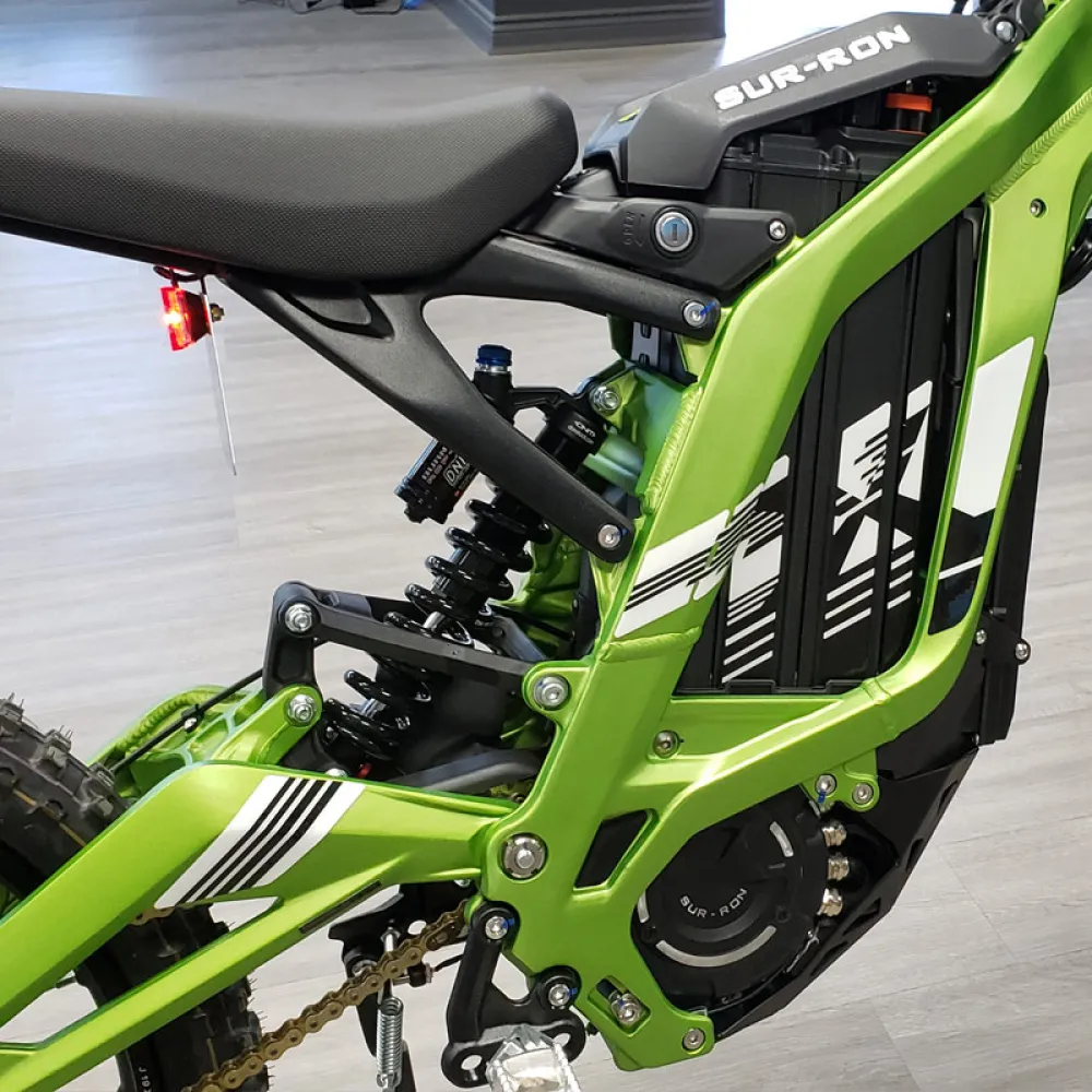 Электропитбайк SUR RON X в зелёной расцветке создан для быстрой езды по дорогам. Он спокойно проедет по грунтовой дороге, не застрянет в песке и ему не страшны горки.