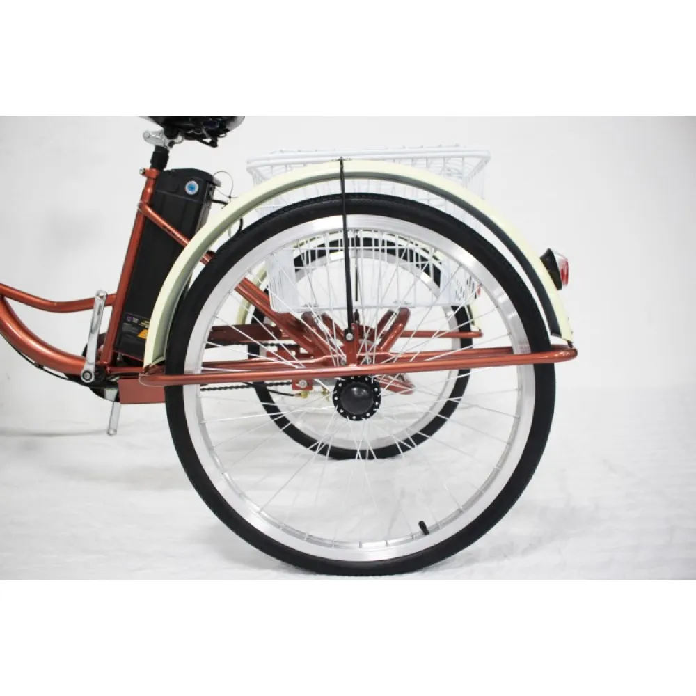 Электровелосипед представлен компактными эргономичными характеристиками, предназначен для ежедневных прогулок и грузоперевозок. Трехколесная модель оснащена всем необходимым для комфорта и удобства. Оснащена 2 компактными корзинами, первая из которых выглядит модно и привлекательно, а вторая – вместительная. Модель оснащена удобным регулируемым сиденьем, повторяющим анатомические части тела ездока, снимающая нагрузку с позвоночника, не допускающая усталости при длительной езде.