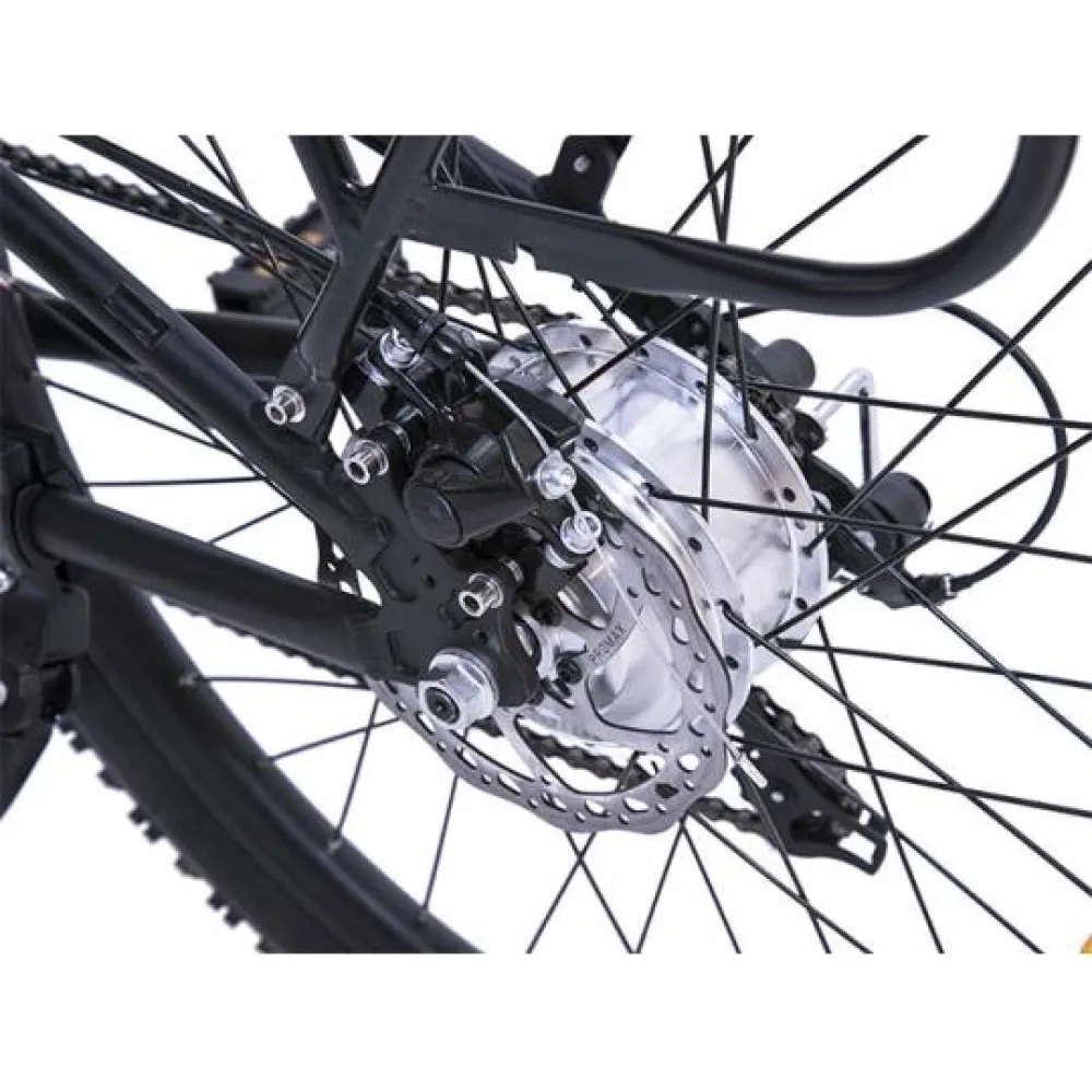 Дисковая тормозная система позволяет уверенно управлять агрегатом в транспортном потоке. Электрический велосипед Wellness CROSS RACK хорошо подходит для загородных поездок по бездорожью, за счет мощного двигателя, амортизации передней вилки и дополнительного заднего амортизатора. Колеса диаметром 26 дюймов с протекторными шинами повышают проходимость.