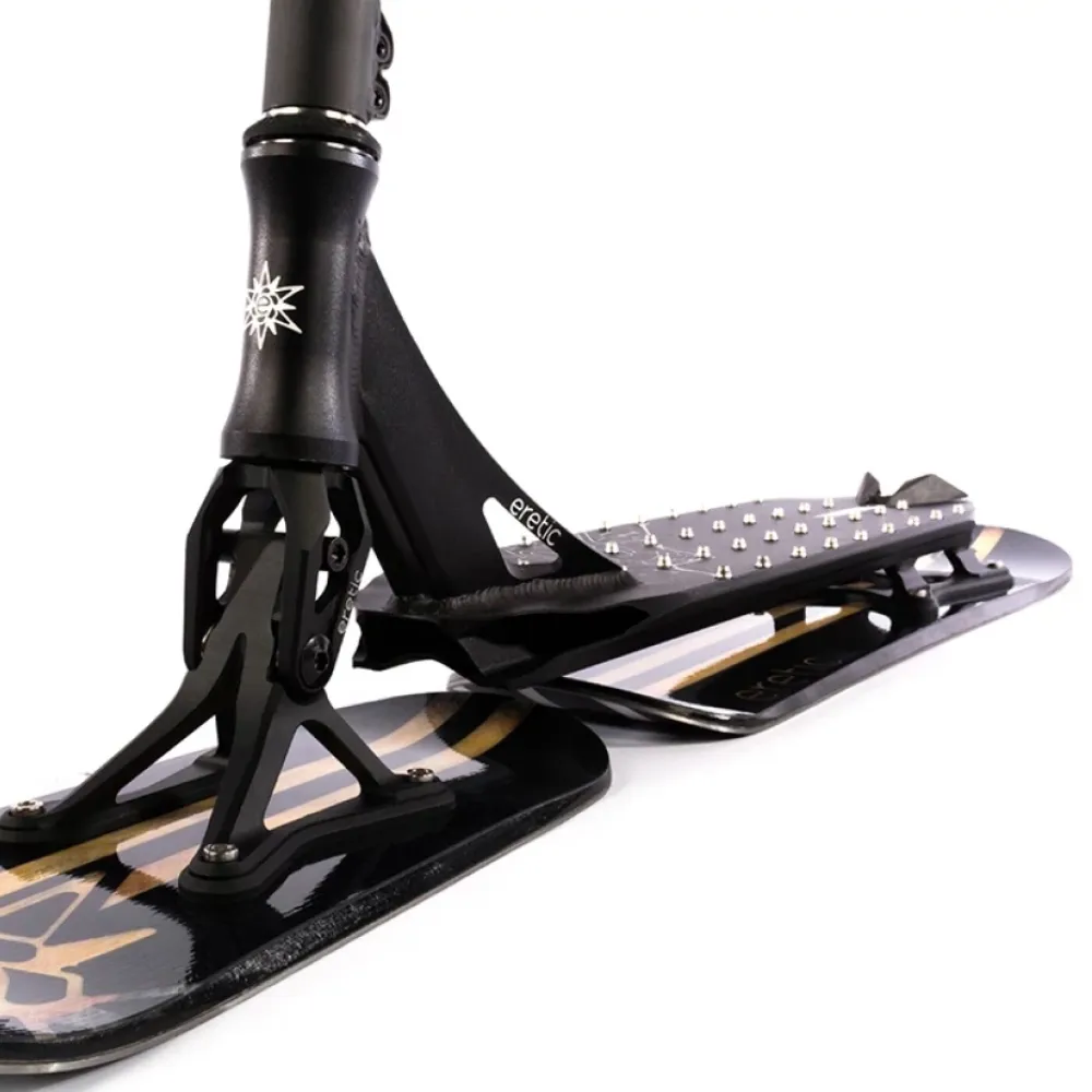 Этот инновационный транспорт напоминает классический самокат, но вместо колес у него установлены лыжи, что делает его идеальным для зимних приключений. Спроектированный для райдеров ростом от 175 до 195 см, он выдерживает максимальный вес до 100 кг. С весом всего 5.16 кг, Eretic Slope обеспечивает невероятную легкость и маневренность на снегу. Руль изготовлен из прочного хромомолибдена (Cr-mo), с внешним диаметром 34.9 мм и размерами 720 мм в высоту и 620 мм в ширину, что обеспечивает надежное сцепление и контроль. Компрессия HIC гарантирует точность и стабильность при выполнении трюков. Вилка и дека выполнены из алюминия, что придает конструкции дополнительную прочность и устойчивость. Интегрированная рулевая система, ширина деки 140 мм и длина 580 мм делают этот самокат идеальным для снежных склонов.
